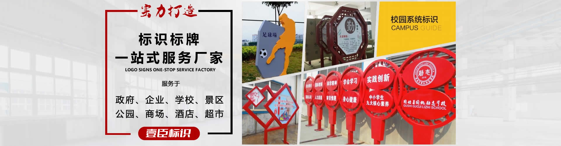上海标牌廠有限公司是一家專業從事(shì)城市公共環境标識設計、标識制作、房地産樓盤标識、園林景區标識、中央商務區标識、工業園标識的開(kāi)發(fā)、設計、制作、安裝及售後(hòu)服務于一體的專業廣告标識設計制作企業。 公司産品廣泛應用于城市公共壞境、高檔社區、商業區域、辦公樓宇、醫療系統、教育機構及通信、交通、電力等行業。“壹臣标識”在設計、研發(fā)、制作過(guò)程中借鑒并吸取了國(guó)内外标識項目的精髓,并結合本地标識業實際情況,爲客戶創造一個又一個标新立異的視覺形象。“壹臣标識”規劃全面(miàn)、合理到位、設計新穎、自然和諧、服務及時、主動完善,真正做到了以人爲本,以創造完美的視覺環境爲己任,力争讓每一個作...